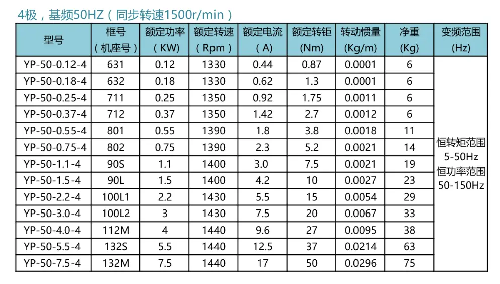 YP变频系列4极型号