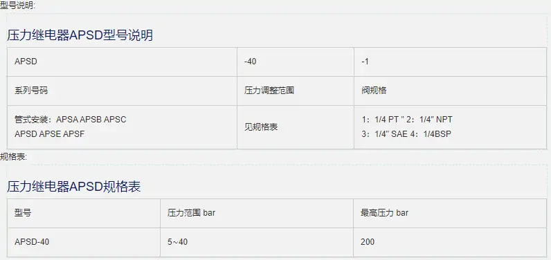 压力继电器APSD有如下型号:APSC-40-1,APSC-40-2,APSC-40-3,APSC-40-4。