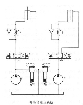 某工厂生产的设备安装升降台液压系统如下图所示,用双泵双回路控制两个顶升液压油缸,实现双缸同时动作或单缸动作。两个同路对应的液压元件规格相同,管路通径相同。