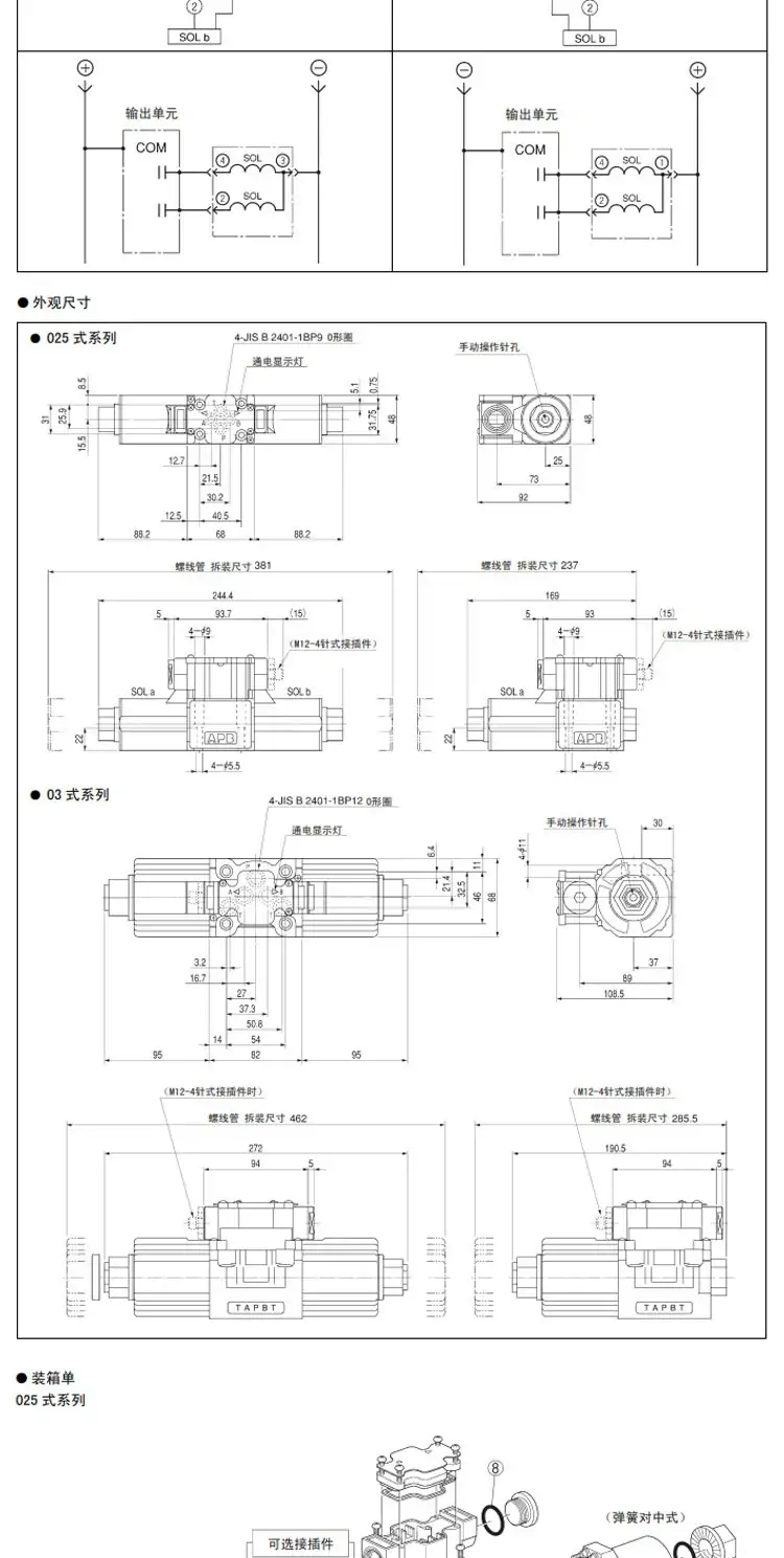 - 特点:双电磁铁无记忆,断电自动回中位;油浸式线圈散热好、寿命长