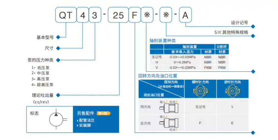 - A:标准基本型,脚座安装,标准轴封、标准油口