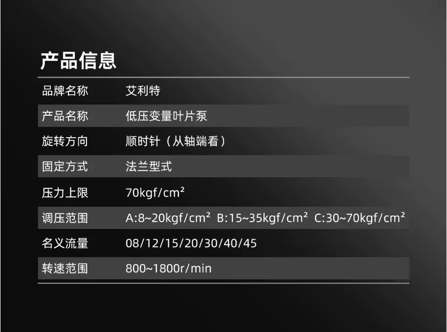 - SVPF-30(变量):压力补偿、流量可调、节能、低压(≤7MPa)、小功率(≤5.5kW)。